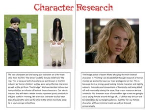 The document discusses basing a horror character on the male child from "The Omen" and the female lead from "The Ring." Key aspects to be incorporated include the white shirt from "The Ring" to represent purity and black trousers like in "The Omen" to appear as an average school boy. Additionally, the main female protagonist will take inspiration from Naomi Watts' character in "The Ring" by being a strong, good-looking woman who subverts horror conventions.