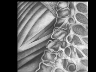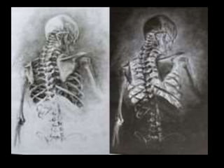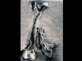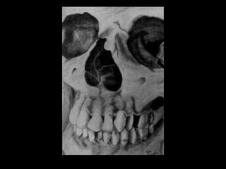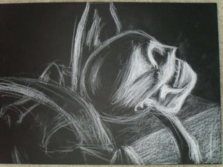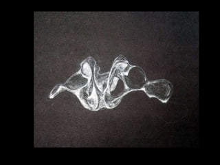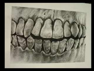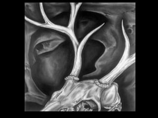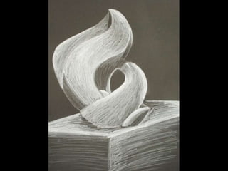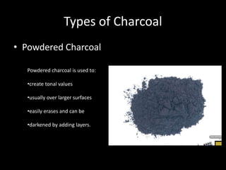 This document discusses different types of charcoal including powdered charcoal, compressed charcoal, vine charcoal, and pure charcoal. It also discusses charcoal accessories like kneaded erasers and gum erasers. Elements of art covered include line, contrast, space, form, and techniques for shading and blending. The last section provides instructions for a bone drawing project requiring an off-center composition that makes the bones look 3D using both light and dark areas. Examples of previous eraser drawings are also shown.