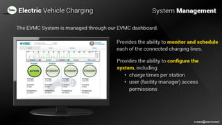 The document outlines the challenges and solutions related to electric vehicle (EV) charging infrastructure, particularly for fleet operation in limited power environments. It highlights the significant power requirements of standard EV chargers and introduces a cloud-managed solution that can reduce costs and demand charges by optimizing charging patterns. The EV charging solution includes advanced management systems and hardware designed to integrate efficiently with existing infrastructure.