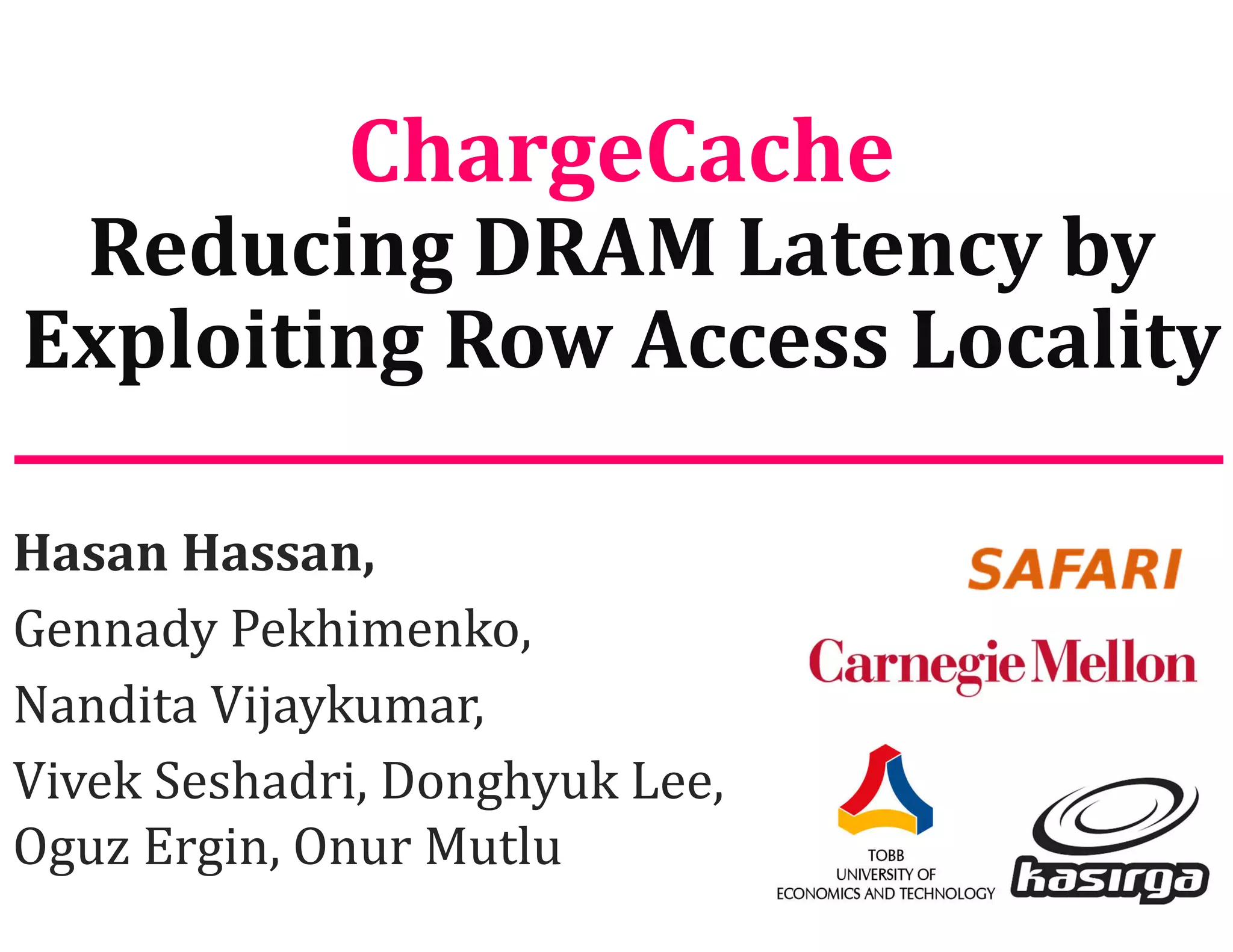 ChargeCache is a technique that reduces DRAM access latency by exploiting row access locality in DRAM without modifying existing DRAM chips. It observes that recently accessed DRAM rows can be reaccessed with lower latency as they remain highly charged. By tracking recently accessed rows, ChargeCache is able to lower DRAM timing parameters for accesses to these rows, improving performance by 8.6-10.6% and reducing DRAM energy by 7.9% on average.