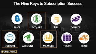 The document outlines strategies for subscription success in a real estate services company, emphasizing customer empowerment and self-service capabilities. It highlights the company's extensive subscriber base and various technological tools available for real estate transactions, alongside detailed operational practices to enhance subscriber experience. Future initiatives include improved onboarding processes and integrations with external partners to streamline billing and operations.
