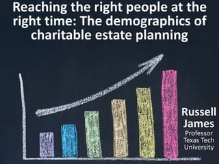 This document summarizes research on charitable estate planning using new longitudinal data tracking the same people from mid-life to after death. Key findings include: 1) having no offspring, higher lifetime charitable giving and donations, and reporting a funded trust best predict making a charitable bequest; 2) average annual giving, ending wealth, having no offspring, and reporting a funded trust best predict the actual dollar amount left to charities. The research provides new insights into reaching people most likely to leave charitable gifts.