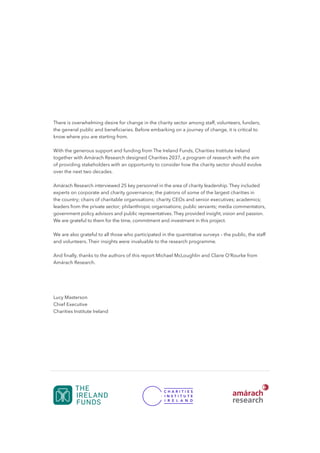 This document summarizes a report on research about the future of the charity sector in Ireland over the next 20 years. It conducted interviews and surveys with various stakeholders to understand their perspectives. Key findings included a desire for change in how charities operate, the need to demonstrate impact through data, issues with regulation and funding, challenges finding qualified people, and improving public understanding and transparency. The research aims to provoke debate on expectations of charities, the role of volunteers, impacts of regulation, needs for professionalism and organizational change, the role of the state, and triggers for change within charities.