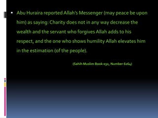 Charity does not decrease wealth according to a saying of the Prophet Muhammad. Forgiving others increases respect, and being humble causes Allah to elevate one's status among people.