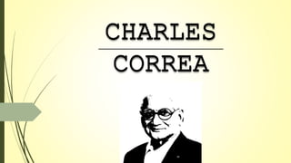 Charles Correa was an Indian architect known for his sustainable designs and principles of incrementality, identity, and pluralism. He designed numerous buildings across India in various styles, incorporating local materials and vernacular elements while bringing a modern sensibility. Some of his most notable works included the Ismaili Centre in Toronto, the Gandhi Smarak Sangrahalaya in Ahmedabad, and the Leela Kovalam resort in Kerala.