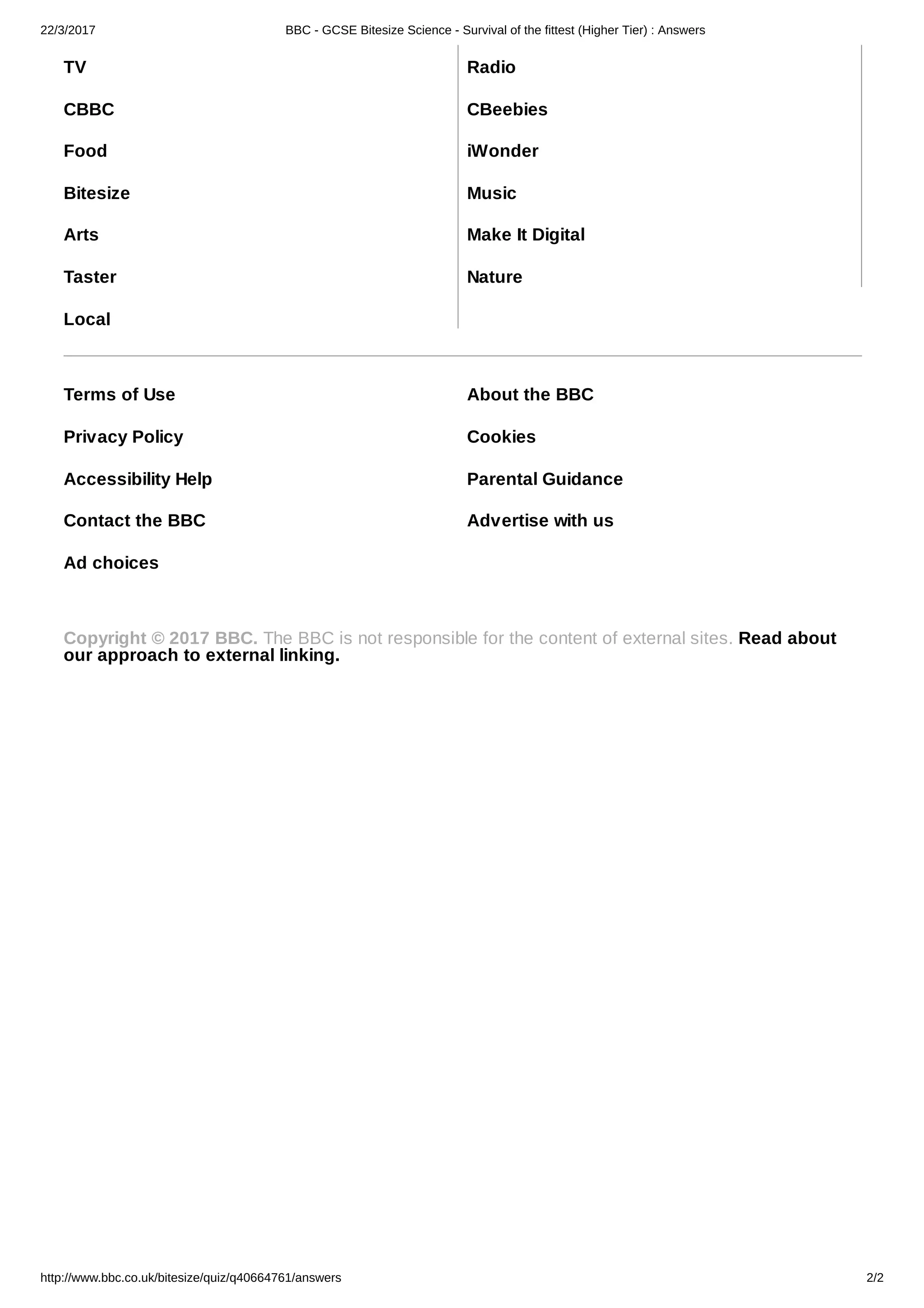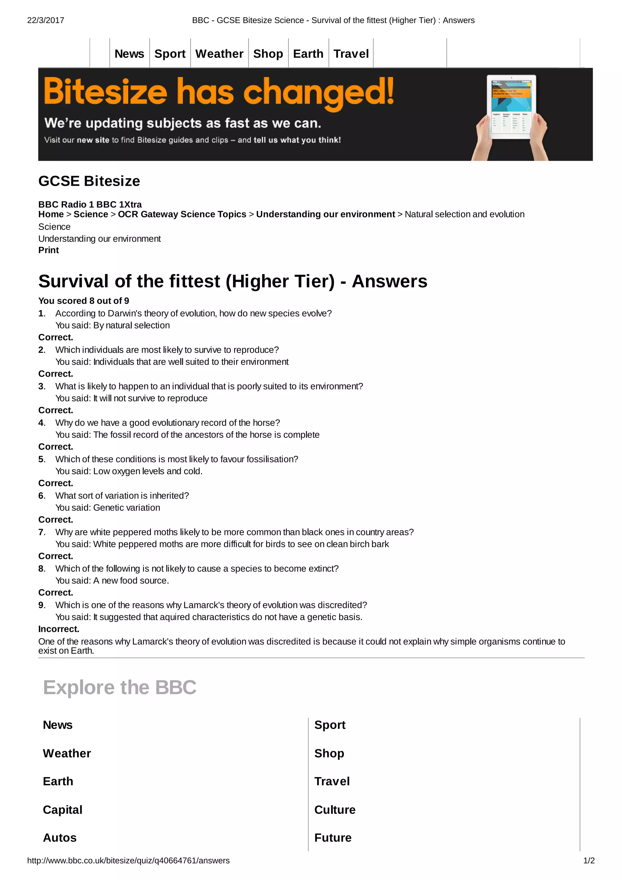 This document contains the answers to a quiz about Darwin's theory of evolution and natural selection from the BBC Bitesize Science website. It provides the correct answers to 9 multiple choice questions testing understanding of key concepts such as how new species evolve through natural selection, which individuals are most likely to survive and reproduce, why genetic variation is inherited, and examples of how natural selection has acted on peppered moths and the horse fossil record. One answer is identified as incorrect, explaining that Lamarck's theory was discredited because it could not explain the continued existence of simple organisms on Earth.