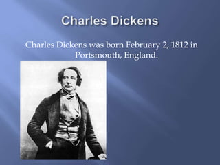 Charles Dickens was born in 1812 in Portsmouth, England and died in 1870. He was one of England's most popular authors and was known for his sympathy towards the poor. Some of his most famous novels include Oliver Twist, A Tale of Two Cities, and Great Expectations. The Mystery of Edwin Drood was his final novel but was left unfinished at the time of his death. Dickens never received any awards during his lifetime as awards for literature were rare, but his works have received recognition through adaptations in other media.