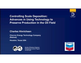 The document discusses a presentation on controlling scale deposition in oil fields. Primary funding for the Society of Petroleum Engineers Distinguished Lecturer Program comes from member donations and contributions from industry partners. The presentation covers topics like scale types, prediction, inhibition strategies, case studies, and chemical quality control. Preventing scale before it starts to form is emphasized as the most cost-effective approach to dealing with scale formation in oil and gas production.