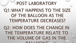 1. The document describes an activity to demonstrate Charles' Law by having students graph the relationship between the volume and temperature of a gas.