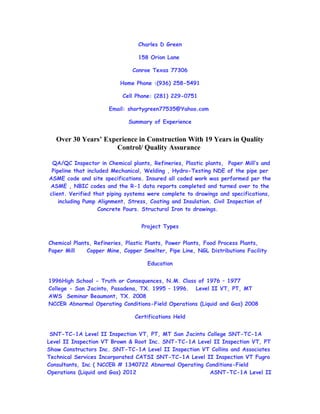 This document provides a resume for Charles D Green, including his contact information, 30+ years of experience in construction quality control and assurance roles, and a history of his relevant work experience overseeing QA/QC for various industrial plants, pipelines, and refineries. He has extensive experience inspecting welding, mechanical work, civil/structural construction, and hydrotesting to verify compliance with codes and client specifications.