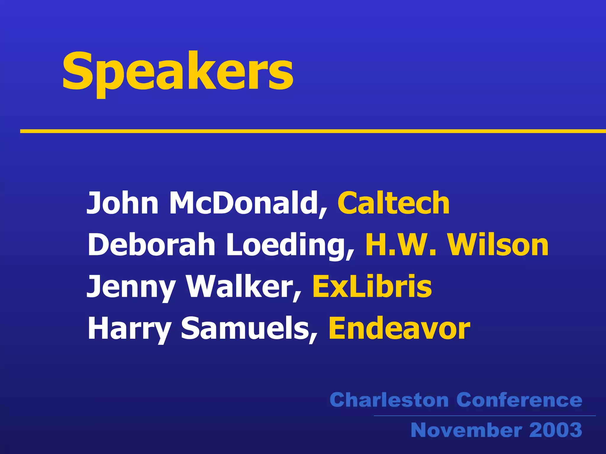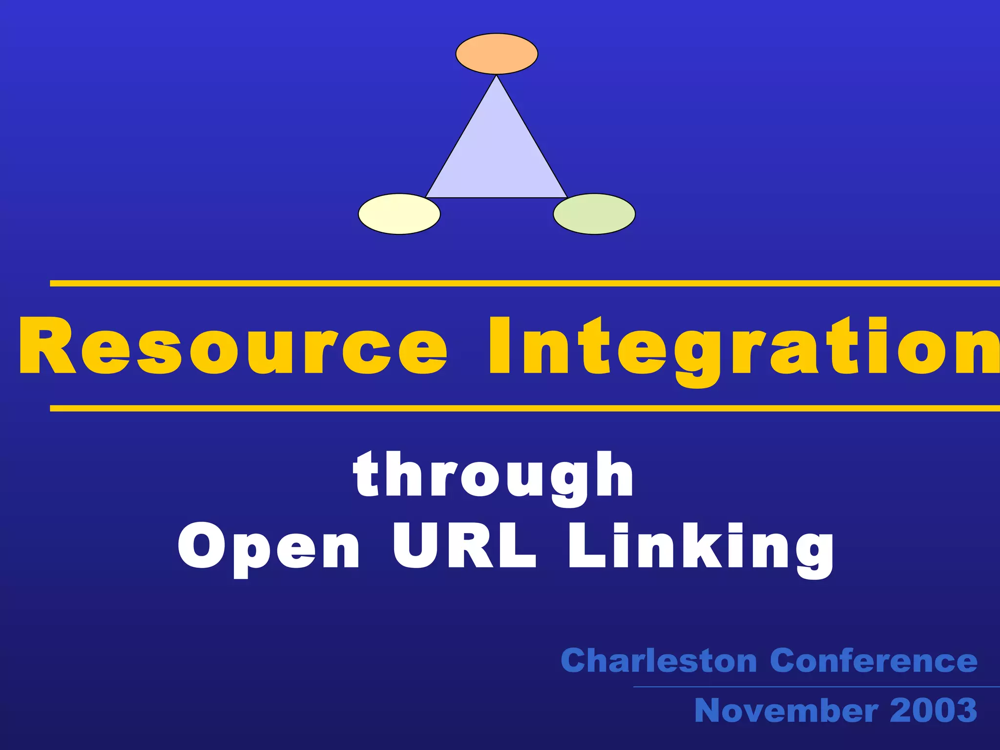 The document discusses resource integration through open URL linking. It provides summaries from several speakers at the Charleston Conference on this topic. John McDonald from Caltech discusses SFX implementation at Caltech. Deborah Loeding from H.W. Wilson discusses the WilsonLink solution. Jenny Walker from Ex Libris discusses link servers and knowledgebases. Harry Samuels from Endeavor discusses what to look for in link resolvers.