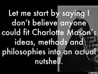 Charlotte Mason advocated for an education approach that focused on exposing children to "living books" or whole, quality works of literature rather than excerpts or anthologies. Students would narrate what they read to help them retain information. Lessons were short but frequent to allow for in-depth study of many subjects. Nature was also an important part of the curriculum through weekly nature walks and time spent outdoors daily. Art, journaling, copywork, dictation and creating a "Book of the Centuries" were also incorporated into Mason's philosophy of education. Afternoons were left open for free time activities.