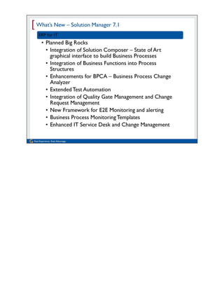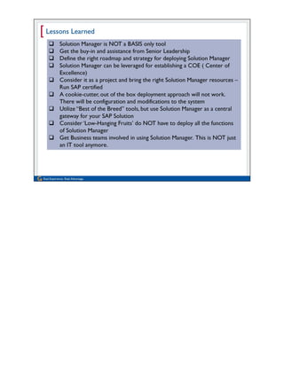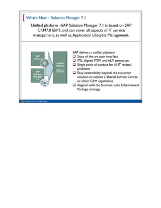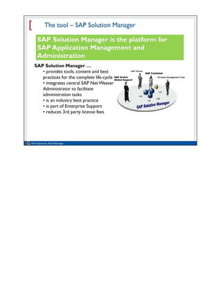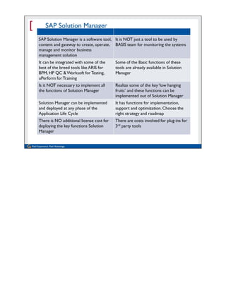 The document discusses problems with reactive IT management including a lack of consistent processes, unclear priorities, and doing more with less. This results in production risks from poor implementation and testing as well as constant emergencies. The document proposes running IT like a business with standard processes, clear strategies and priorities aligned with business needs, and showing value through cost-benefit analysis to be a trusted partner. This would allow the CIO to maximize contribution, a PMO to drive successful projects, and managers to ensure system uptime and on-time project delivery. It then asks questions about how an SAP solution is currently managed.