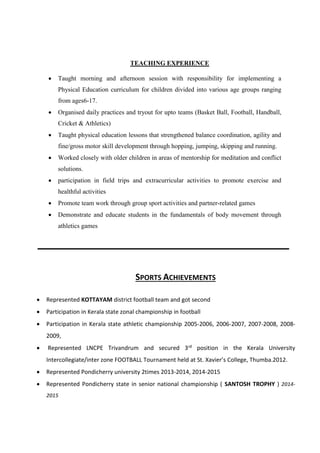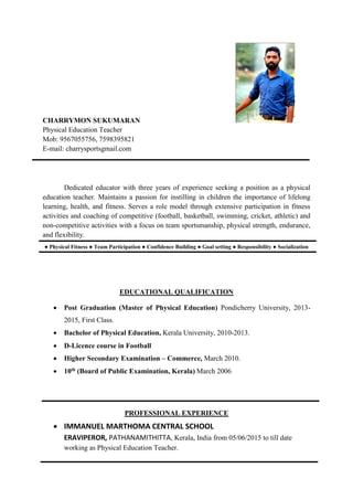 This document provides a summary of qualifications and experience for Charrymon Sukumaran, a physical education teacher. He has over 3 years of experience teaching physical education to students ages 6-17. He is passionate about instilling the importance of health, fitness, and teamwork. His qualifications include a Master's degree in Physical Education and experience coaching and participating in various competitive sports like football, basketball, swimming, and cricket.