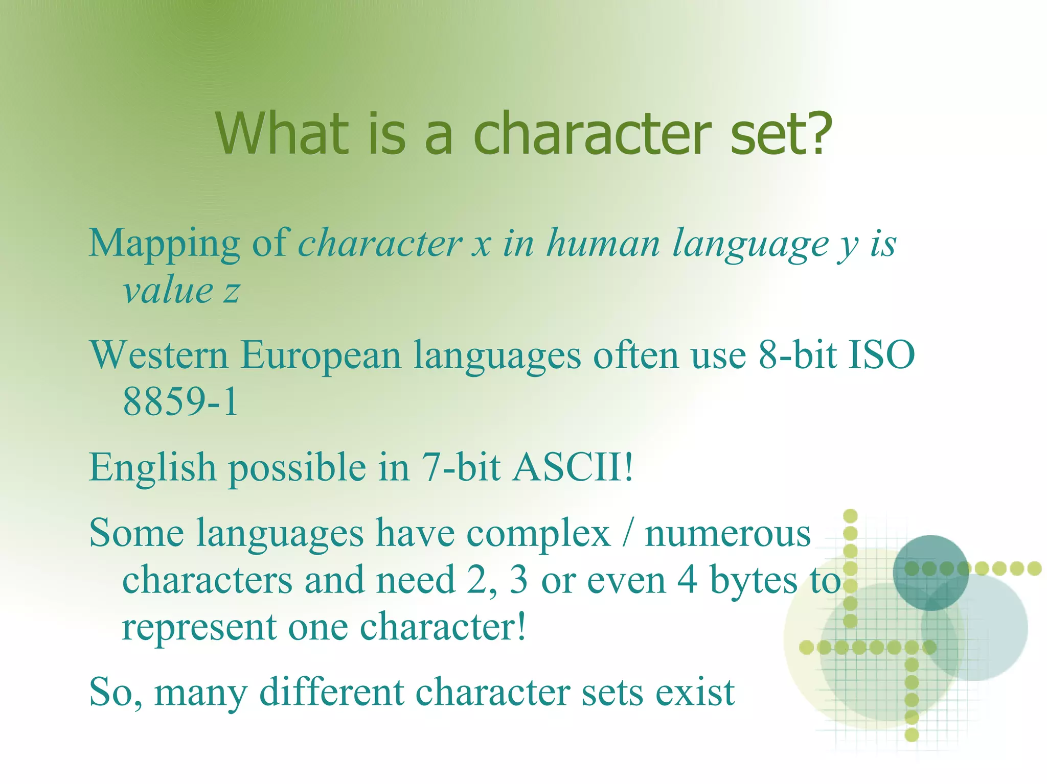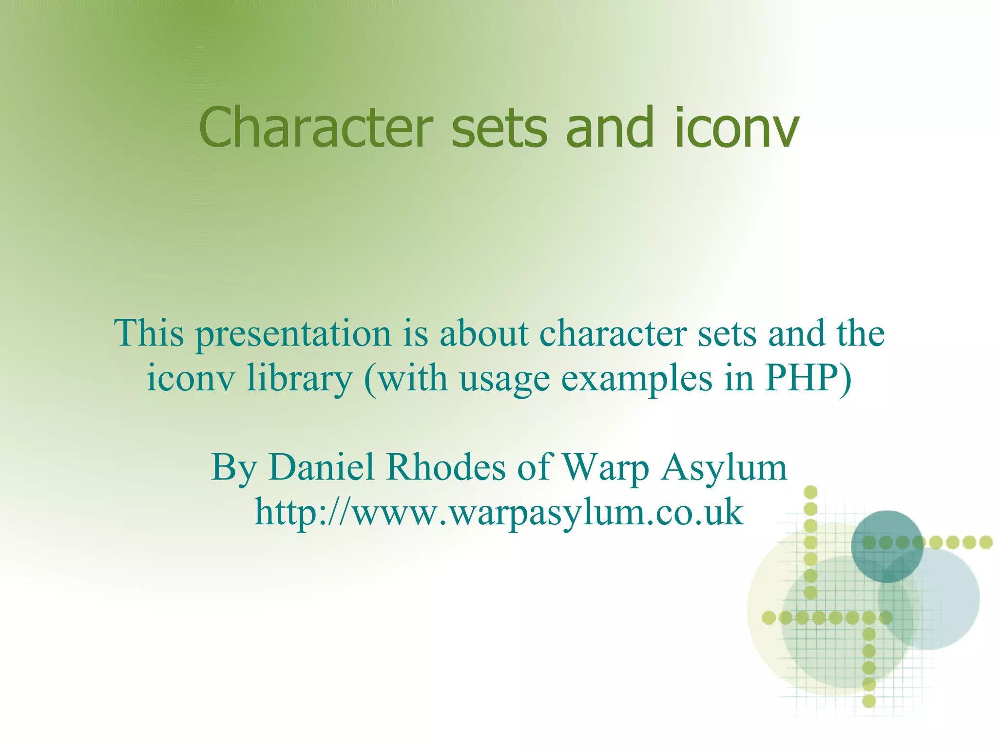This document discusses character sets and the iconv library for converting between character sets. It provides examples of using iconv in PHP to: 1) convert between character sets; 2) transliterate characters that do not exist in the target character set; and 3) use the output buffer handler to automatically convert character sets for output.