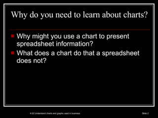 Charts and graphs are used in business to present spreadsheet information in a visual format that is easier to understand than raw numbers. A chart includes a title, value labels, and legend to plot data from one or more data series on a graph with an x-axis, y-axis, and data markers. Common chart components are the plot area, gridlines, tick marks, legend, data labels, axis titles, and chart title, each serving to clearly display and identify the visualized data.