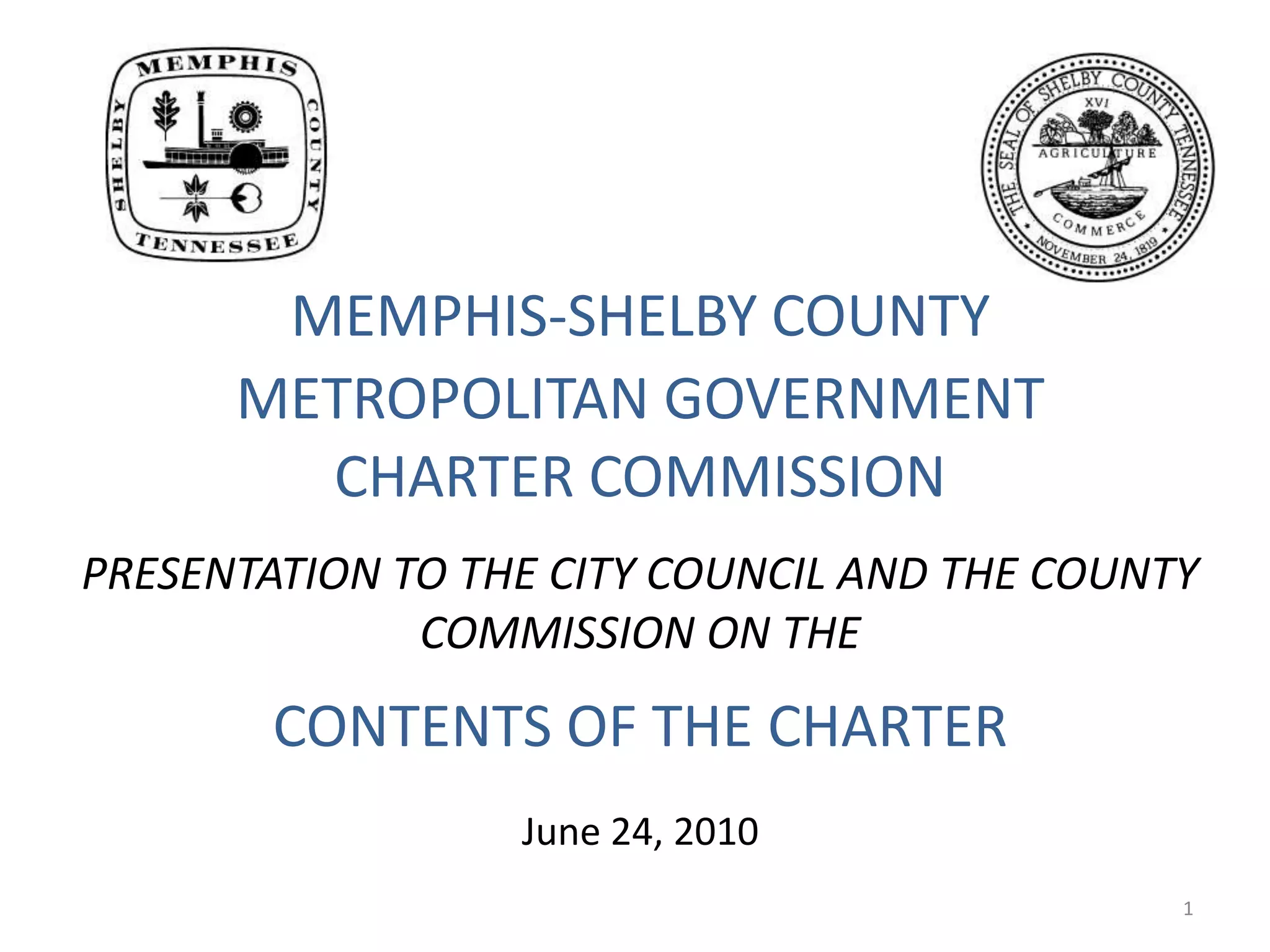The document outlines the findings and recommendations of the Memphis-Shelby County Metropolitan Government Charter Commission regarding the restructuring of local government to enhance efficiency, reduce redundancy, and respond to community needs for better public services. It highlights the challenges faced by the current government structures, the economic opportunities for collaboration, and a proposed charter that includes stringent ethics regulations and revised governance frameworks. Key recommendations address intergovernmental relations, public safety, economic development, and the management of social services and taxation.