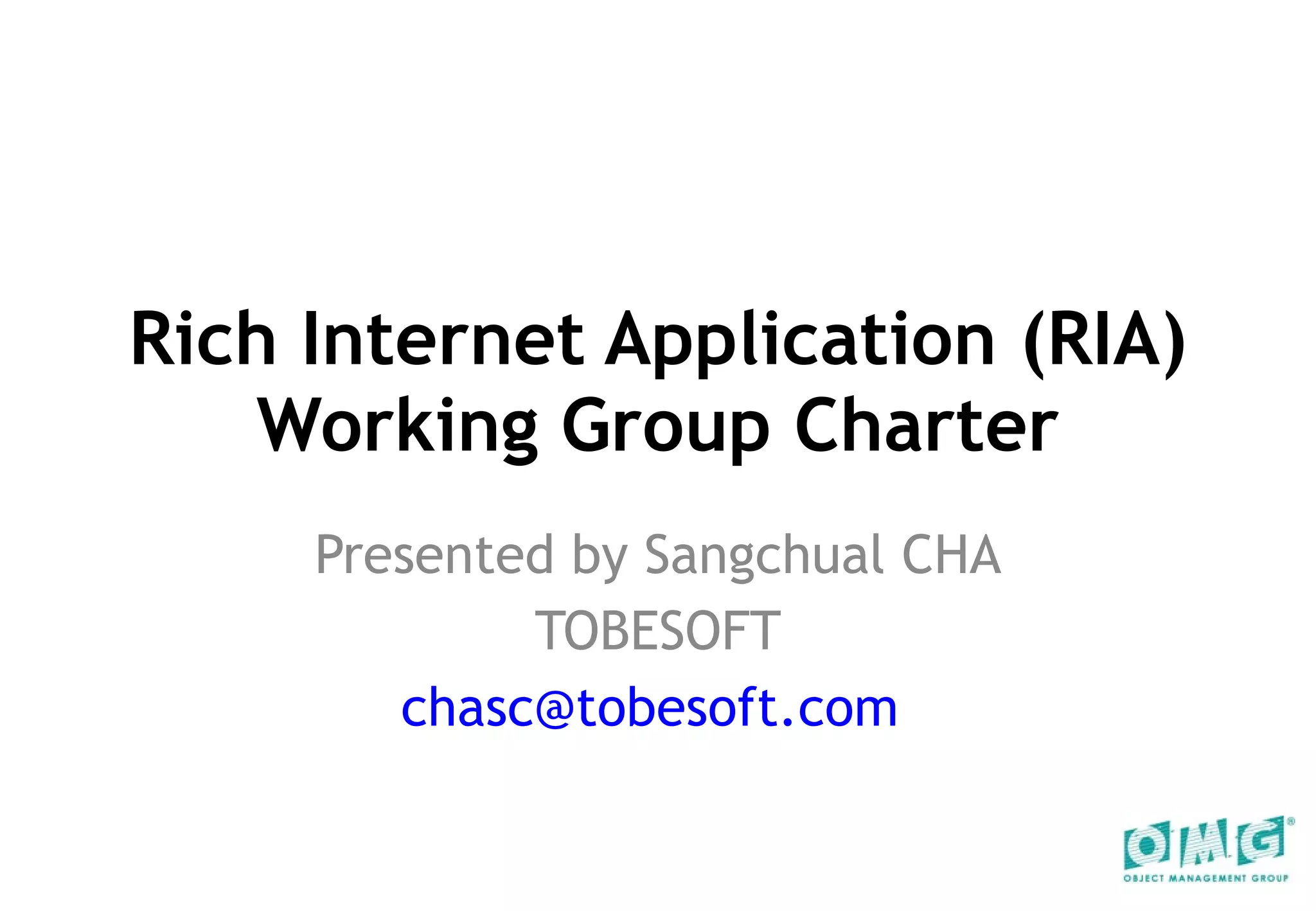 The document outlines the goals and scope of the Rich Internet Application (RIA) Working Group. The group aims to develop standards for RIA component interoperability and platform interworking. This will include specifications for an RIA platform architecture, component model, and application description language. The work will address issues of diversity across RIA platforms and components by preserving web benefits through standardized technical specifications.