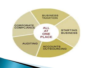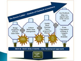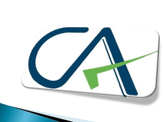 The document summarizes the path to becoming a Chartered Accountant in India. It involves passing the Common Proficiency Test (CPT), the Integrated Professional Competence Course (IPCC) with two groups of subjects, and then the Final exam with two groups. Students must also complete 3 years of apprenticeship training and 100 hours of IT training. The Institute of Chartered Accountants of India (ICAI) regulates the profession and has its headquarters in New Delhi along with 5 regional offices in major cities. Chartered Accountants work in fields like audit, taxation, finance, banking, outsourcing, academics, and the corporate sector.