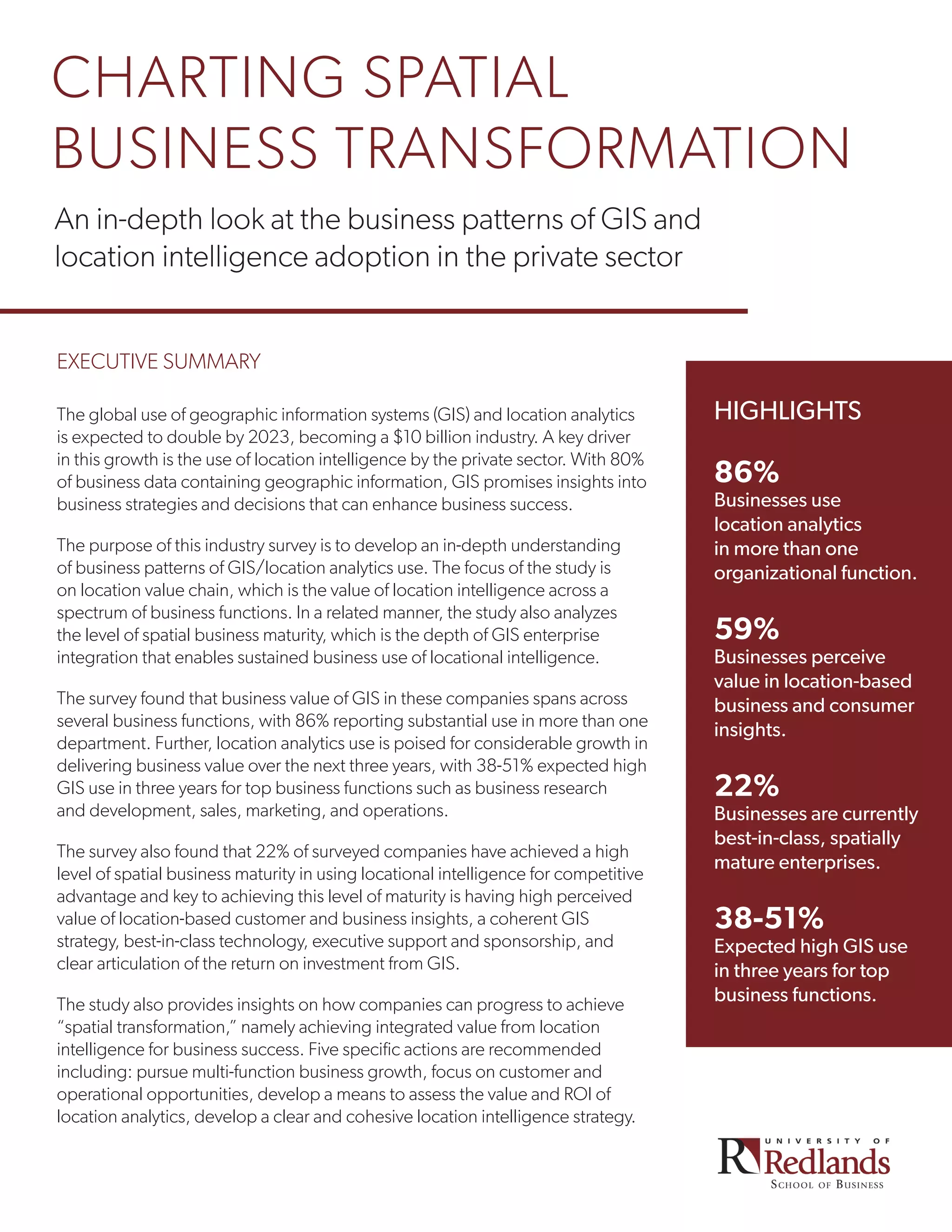 The document discusses the findings of a survey on the use of geographic information systems (GIS) and location analytics in the private sector. Some key findings include: