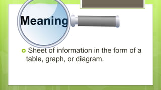 A chart is a visual representation of information, such as tables and graphs, used primarily for educational purposes to enhance learning by presenting data in an organized manner. Various types of charts exist, including flow, pie, and genealogy charts, each serving unique functions in conveying relationships and continuity in learning. While charts can engage learners and clarify concepts, they also have limitations, such as being less effective for large audiences and requiring additional explanations.