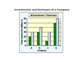 This document discusses various types of charts and graphs, including organizational charts, classification charts, timelines, flowcharts, and tabular charts. It provides examples of each type of chart. The document also discusses the purpose of charts, how to design effective charts, and software that can be used to create charts and graphs, such as OpenOffice Calc and Microsoft Excel.