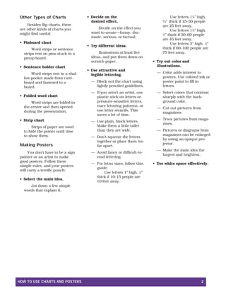 - Charts and posters can be used to attract attention, develop ideas, present information to groups, and highlight key points. Effective designs use large, legible lettering and emphasize important words.