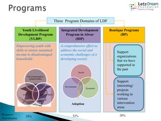 The document summarizes three program domains of the LetzDream Foundation (LDF): 1) The Youth Livelihood Development Program (YLDP) which empowers youth with skills to ensure sustained income for disadvantaged households; 2) The Integrated Development Program in Alwar (IDP) which comprehensively addresses social and economic challenges of a developing society; and 3) Boutique Programs which support past partner organizations and new projects in various areas. Results of the YLDP include improved human, financial, social, and physical capital. The IDP focuses on social, environmental and economic sustainable development through partnerships in its selected blocks. Boutique Programs provide diverse sector support for innovations and consistent funding to scale programs