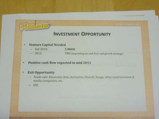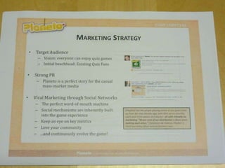 The document discusses a case study on Planeto, a quiz platform, emphasizing the importance of preparing an effective pitch for potential investors. It outlines key elements such as the founder's background, product, market, financials, and investment requests while advising on pitch delivery, networking, and understanding venture capital terminology. Final tips include maintaining passion for the business idea, being in control of company valuation, and the emotional challenges of raising funds.