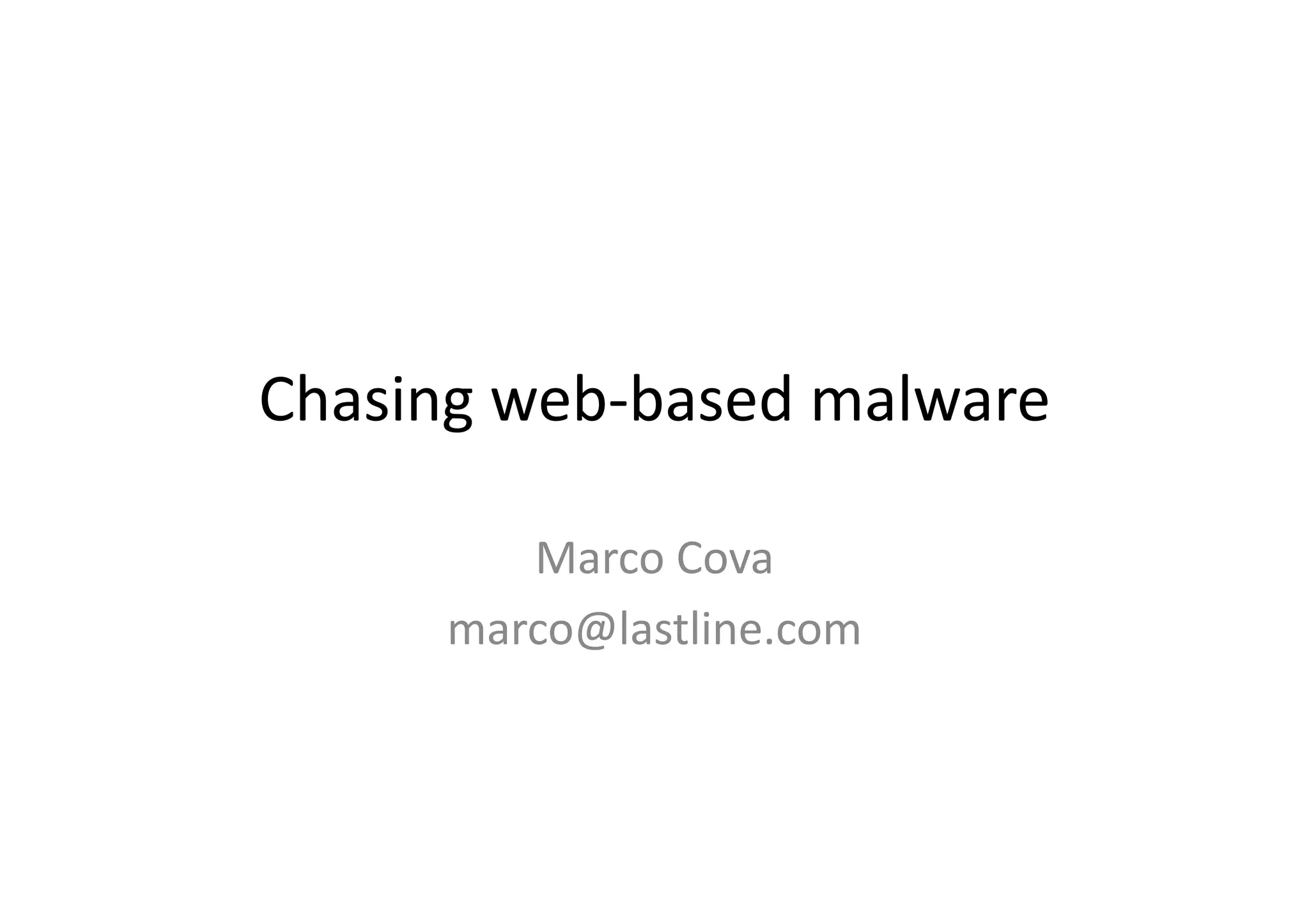 This document discusses chasing web-based malware. It describes how web-based malware works through malicious JavaScript and social engineering techniques. It then summarizes approaches for detecting web malware, including dynamic analysis oracles that run web pages in instrumented environments, static filtering to quickly classify pages as benign or malicious, and the Wepawet tool which has analyzed over 67 million web pages.