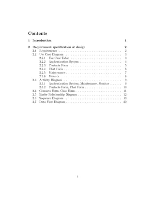 This document contains the requirement specification and design for a chat application. It includes use case diagrams and tables describing the authentication system, contacts form, chat form, maintenance, and monitoring features. It also includes activity diagrams, class diagrams, entity relationship diagrams, and sequence diagrams modeling the application's functionality and architecture. The data flow diagrams show the high-level data flows and data transformation processes within the chat application.