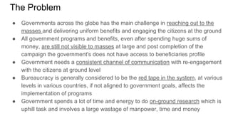 Chat bots can help governments in e-governance by providing a consistent channel of communication with citizens, personalizing services, educating citizens about programs and benefits, and streamlining transactions. Governments currently struggle to reach all citizens and ensure programs are visible and accessible. Chat bots could engage with citizens directly through popular messaging apps, inform them of updates, and help with tasks like payments and document retrieval in a more efficient way than existing bureaucracy. Several governments are already experimenting with chat bots to improve citizen services and experience.