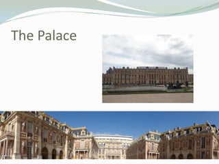 The document describes the layout of the Palace at Versailles including the King's Chambers, Queen's Chambers, Royal Dining Room, Hall of Mirrors, and Gardens. Versailles served as an example of wealth and power for the French monarchy.