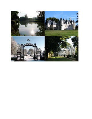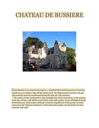 Castle Bussiere is a 12th-13th century castle located in Touraine, France that was transformed in the 16th-17th centuries. It has two round towers on either side of the main building and a magnificent 14th century spiral staircase. The interior contains seven reception rooms with Renaissance fireplaces and decorative elements from the Renaissance period. The 30 hectare property includes the castle, stables, swimming pool, tennis court converted to an outdoor riding school, and cleared woods and fields surrounding the buildings.