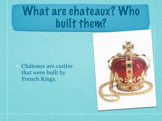 The document provides information about Châteaux in the Loire Valley region of France. It discusses that Châteaux were castles built by French Kings in the 10th century. It then focuses on the specific Château de Villandry, describing how it was built and remodeled over time. It also notes an important event that took place there in 1189. The document concludes by describing the Château Tourelles as a 19th century romantic château that would be an ideal place for a fairytale-themed wedding or birthday stay.