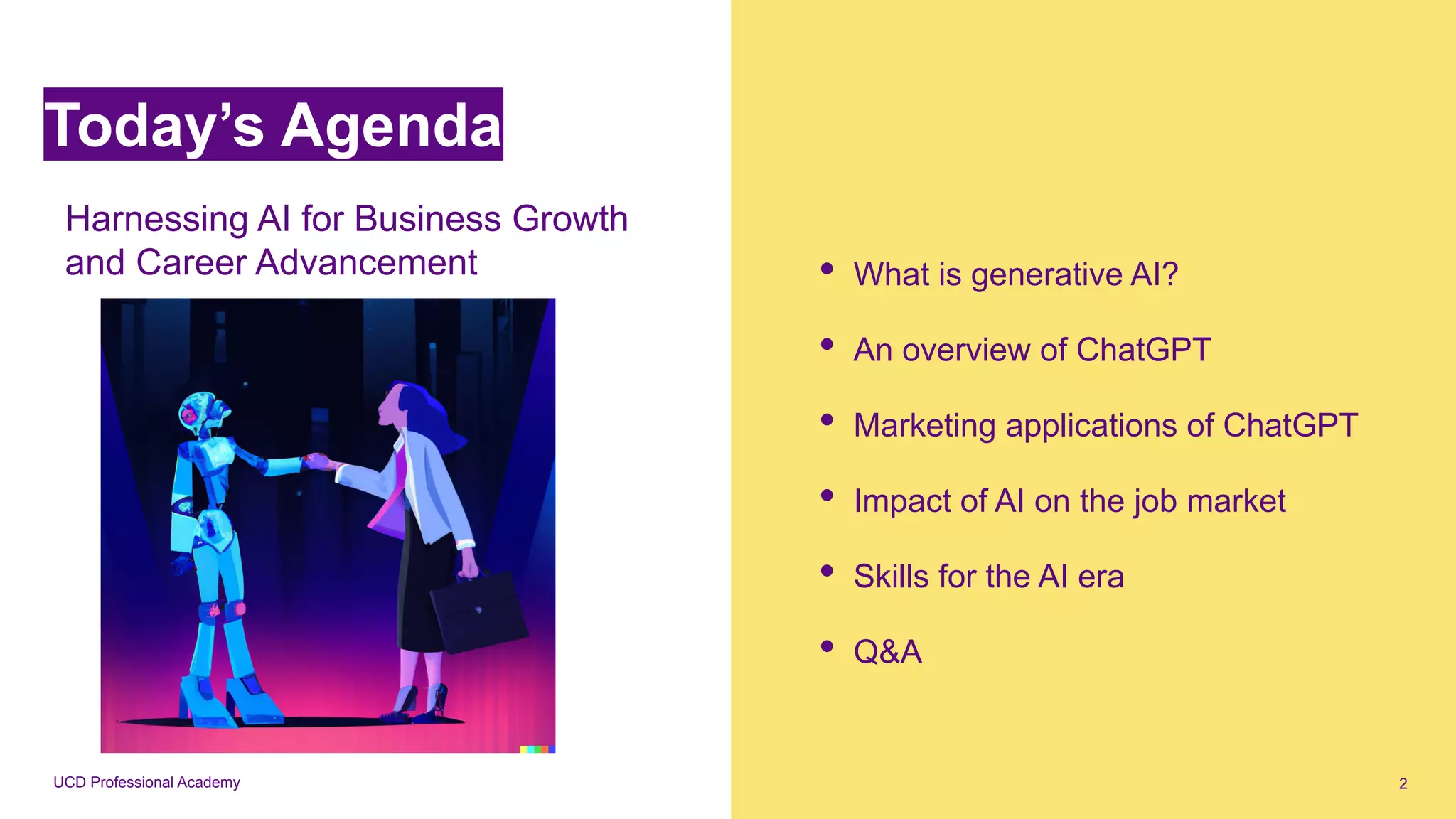 The document provides an overview of generative AI, particularly focusing on ChatGPT and its implications for business and the job market. It discusses the rapid growth of generative AI, its applications in marketing, and the skills needed for the AI era while addressing potential job displacement and the need for adaptation. The agenda includes a Q&A session and emphasizes rethinking work in collaboration with AI technology.