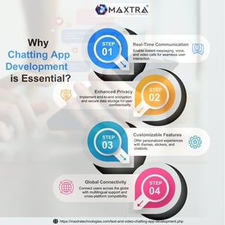 The document outlines key features of real-time communication tools, including instant messaging, voice, and video calls. It emphasizes enhanced privacy through end-to-end encryption, customizable features for personalized user experiences, and global connectivity with multilingual support. The document advocates for the importance of chatting app development for improved user interaction.