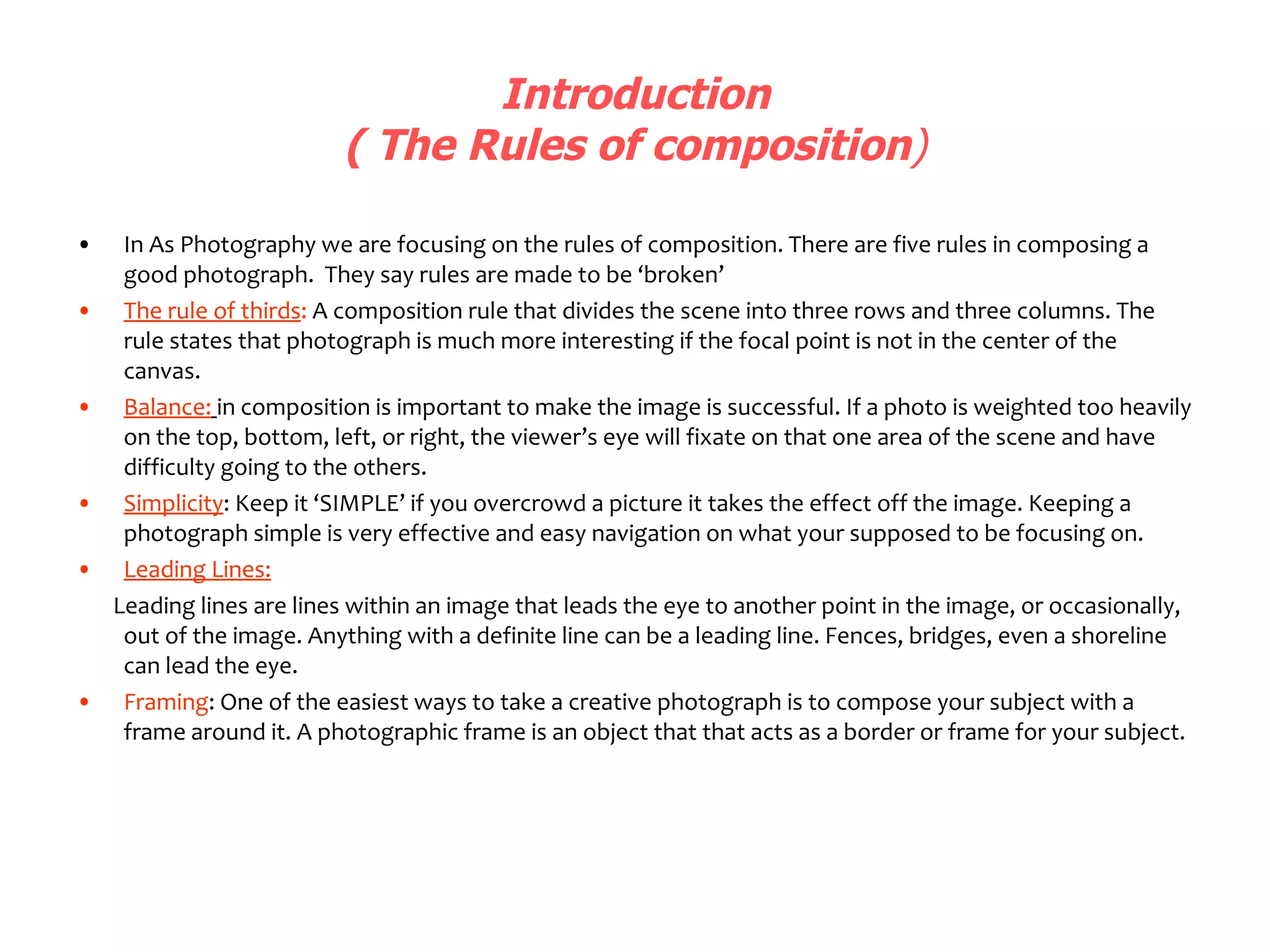 The document discusses five rules of photographic composition: the rule of thirds, balance, simplicity, leading lines, and framing. The rule of thirds involves dividing the frame into thirds and placing the subject off-center. Balance ensures no area of the frame is weighted too heavily. Simplicity keeps the image clear by avoiding clutter. Leading lines guide the eye through the frame. Framing uses natural or artificial borders to enhance the subject. Examples are provided illustrating each rule.