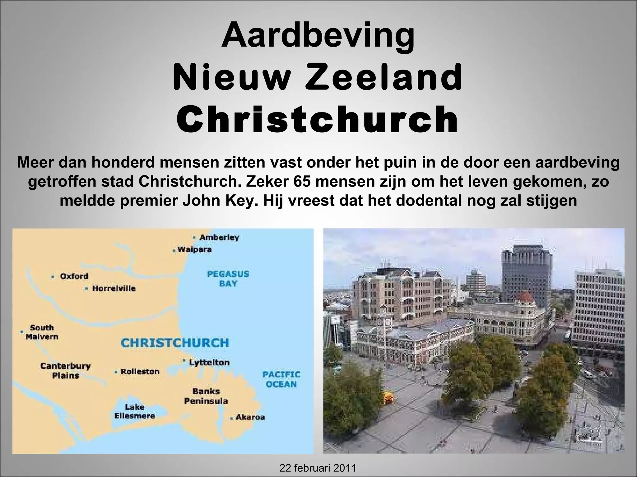 Meer dan honderdmensen zitten vast onder het puin in de door een aardbeving getroffen stad Christchurch. Zeker 65 mensen zijn om het leven gekomen, zo meldde premier John Key. Hij vreest dat het dodental nog zal stijgen Aardbeving Nieuw Zeeland Christchurch 22 februari 2011