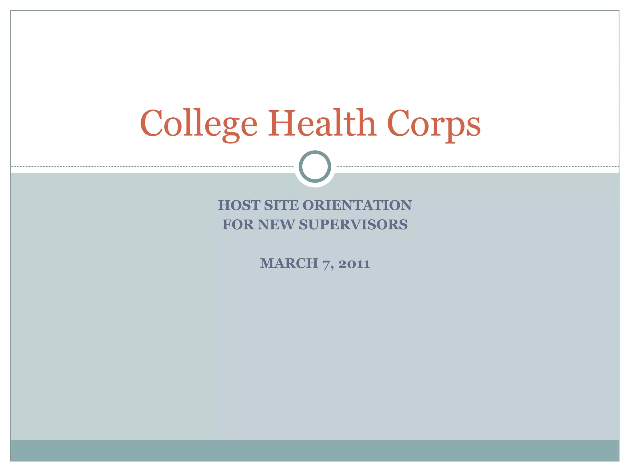 This document provides an orientation for new supervisors of College Health Corps sites that will host AmeriCorps VISTA members during the 2011-2012 service year. It outlines the role and expectations of VISTA members, responsibilities of supervisors, and the recruitment and selection process. Key points include that VISTAs focus on capacity building projects, cannot perform direct service or replace staff tasks. Supervisors must provide strong communication, structure, and feedback to guide VISTA members. The timeline and required paperwork for selecting a VISTA member by April 29th is also reviewed.