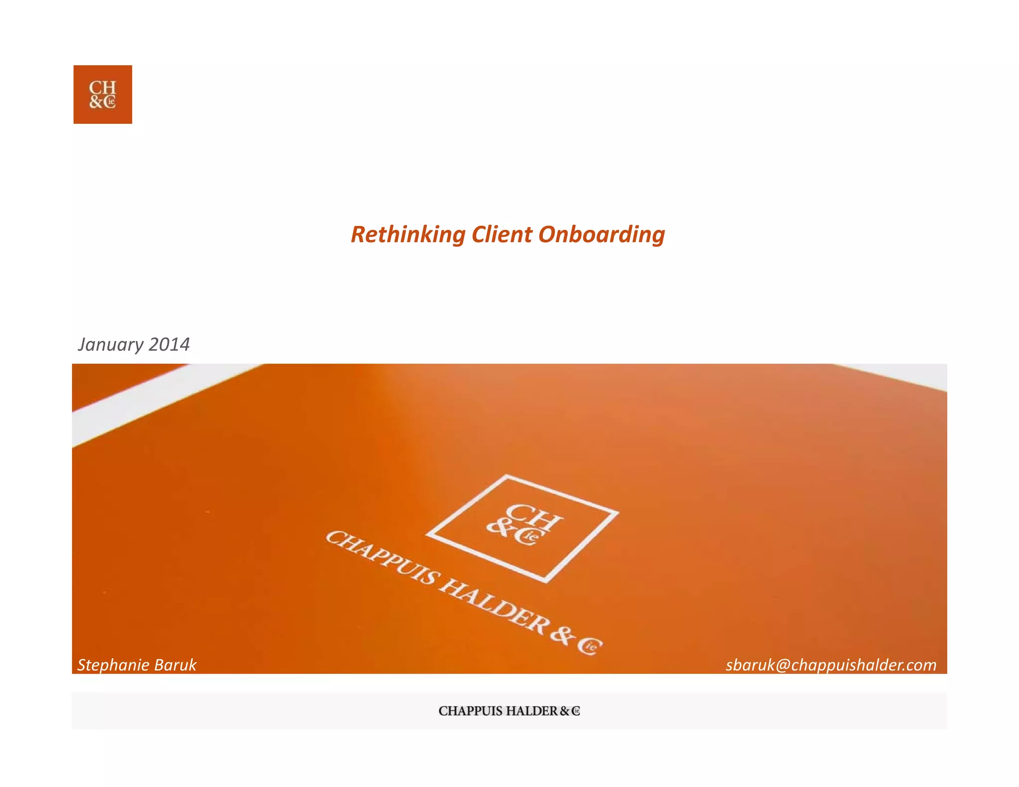 This document discusses rethinking client onboarding processes in response to increasing regulations. It identifies key regulatory impacts that are driving changes to client onboarding, including more robust client identification and data collection. It also analyzes current challenges faced by banks in onboarding clients, such as fragmented processes, lack of data standardization and system interoperability issues. Finally, it proposes several key success factors for transforming client onboarding, such as establishing a single point of contact, globalizing and standardizing processes, centralizing data, focusing on legal entity identifiers, and implementing ongoing monitoring.