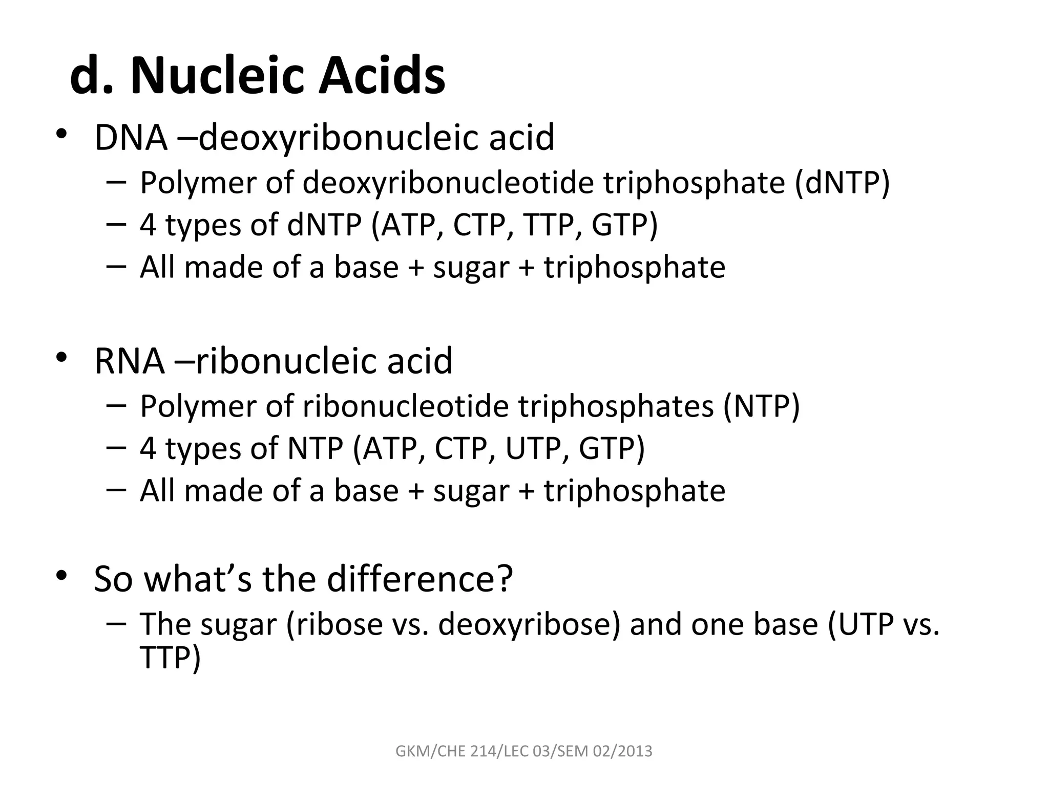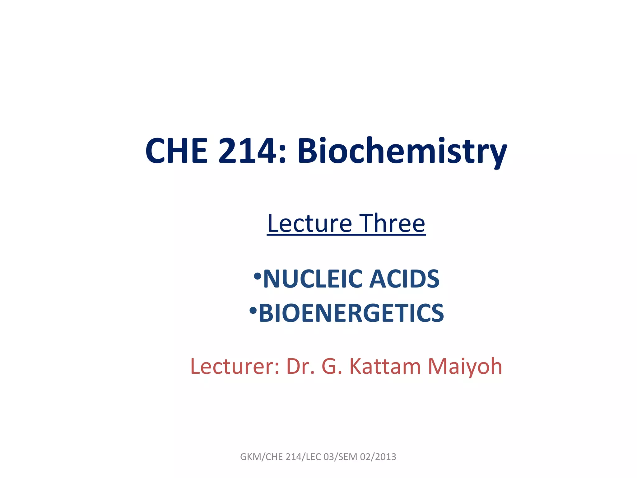The document summarizes a lecture on nucleic acids and bioenergetics. It discusses the basics of DNA and RNA, including their components, structures, and functions. It covers DNA structure including the double helix formation and base pairing. It also discusses RNA types and functions. The second part of the lecture covers bioenergetics, including ATP generation through phosphorylation, carbohydrate metabolism like glycolysis, and historical discoveries around glycolysis.