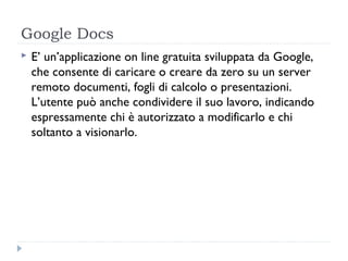Google Docs è un'applicazione online gratuita di Google che consente la creazione, modifica e condivisione di documenti. È accessibile tramite un account Google e offre diverse funzioni di videoscrittura. La piattaforma è particolarmente utile per l'apprendimento cooperativo e l'interazione in tempo reale tra gli studenti, facilitando un approccio didattico moderno.