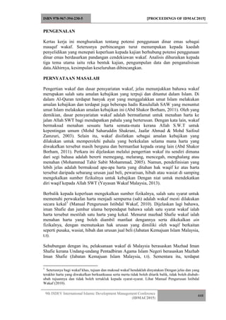 Dokumen ini membahas potensi penggunaan dinar emas sebagai mauquf wakaf dalam konteks kelemahan wang fiat, yang dianggap tidak stabil dan sering kali melibatkan unsur riba, inflasi, dan ketidakpastian. Dengan menggunakan analisis kandungan, penulis mengemukakan bahwa dinar emas dapat memberikan solusi yang lebih baik untuk urusan keagamaan seperti wakaf, yang berlandaskan pada prinsip muamalat Islam. Kesimpulan menekankan perlunya keseriusan umat Islam dalam kembali kepada penggunaan dinar emas sebagai alat pertukaran yang sesuai dengan syarak.
