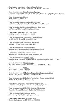 Kumpulan cheat untuk game GTA San Andreas di PS2. Berisi lebih dari 50 cheat yang memberikan efek seperti senjata, kendaraan, kekuatan, dan lainnya. Cheat-cheat tersebut dapat memudahkan pemain dalam menyelesaikan misi dan menjelajahi kota dalam game.