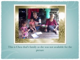 Chea Thul is a woman living in poverty in Cambodia who makes only $2 per day and needs $700 for a loan to increase her rice production. Donating to her would help feed her family and indirectly support Cambodia's economic development by growing more agricultural output. The requested $700 loan would be paid back in monthly installments ending in January 2012, allowing Chea Thul to increase her production and income to support herself and her country.
