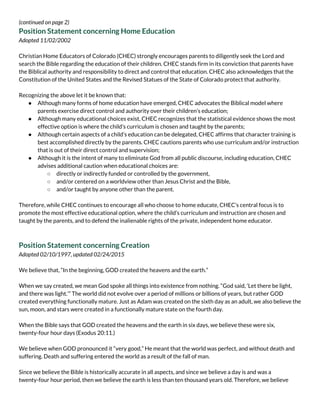 Christian Home Educators of Colorado (CHEC) envisions families honoring Jesus Christ through parent-directed, Christ-centered home discipleship free from government control. CHEC's mission is to motivate parents to disciple their children to impact the state and beyond for Christ by providing information, leadership, and resources. CHEC's doctrinal statement affirms the Bible as God's inspired word and outlines core beliefs about God, man, salvation, and other theological concepts. CHEC also advocates for the biblical model of parent-directed home education and cautions against government involvement or secular worldviews in children's education.