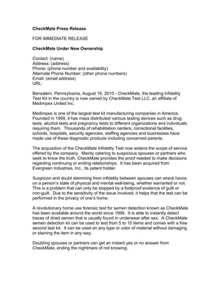 CheckMate, a leading infidelity test kit company, has been acquired by Medimpex United Inc., one of the largest test kit manufacturers in America. The acquisition expands Medimpex's product offerings to include the CheckMate home use test kit, which allows individuals to privately test clothing and linens for traces of dried semen as a way to gain evidence of a partner's potential infidelity. CheckMate provides users with instant results and aims to help end uncertainty in relationships through its conclusive testing.