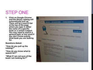 1. Use the library catalog website to search by book title, subject, or keyword if unsure.