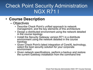 - The course objectives which include learning how to design distributed Check Point environments, install Gateways, perform backups and restores, troubleshoot issues, and more.
